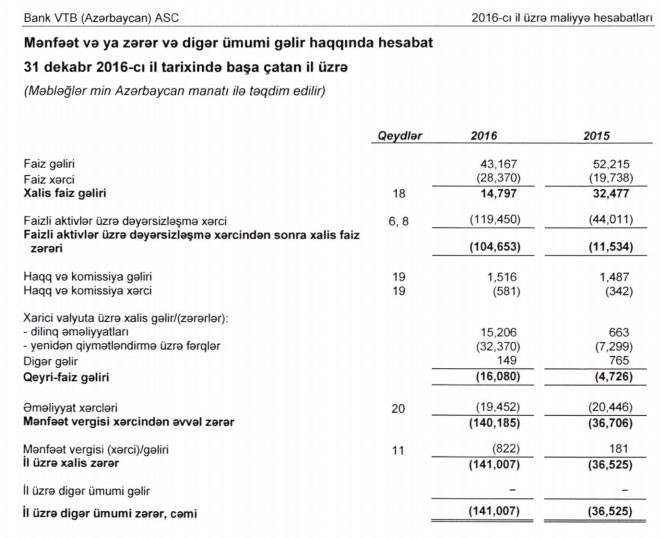 “Marja” Hesabata istinadən xəbər verir ki, Bank ötən ili 141 milyon manat zərər ilə başa vurub. "Bank VTB (Azərbaycan)" 2015-ci ildə 36 milyon 525 min manat zərər açıqlamışdı. Beləliklə, son 2 ildə Bankın cəmi zərəri 177 milyon manatı keçib.