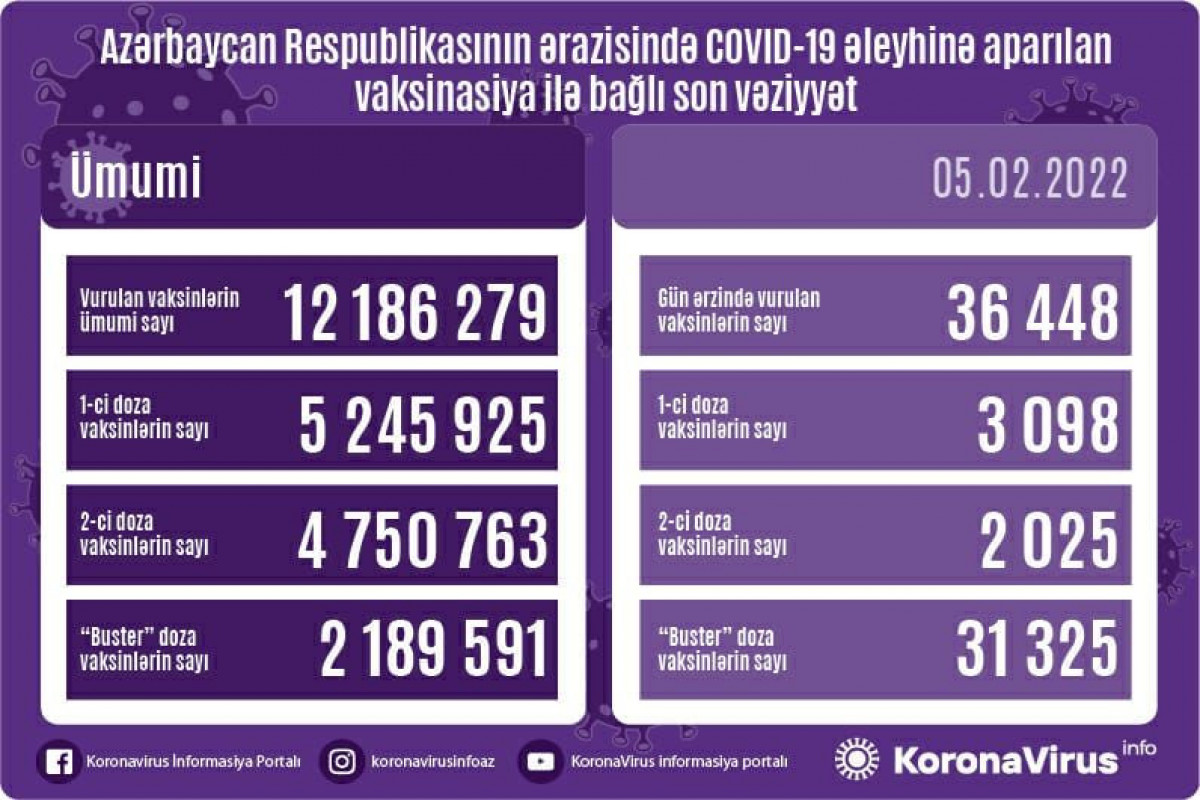 Azərbaycanda son sutkada koronavirus (COVID-19) əleyhinə 36 448 vaksin vurulub. Bir gündə birinci mərhələ üzrə vaksinasiya olunanların sayı 3 098, ikinci mərhələ üzrə vaksinasiya olunanların sayı 2 025, "buster" doza üzrə vaksinasiya olunanların sayı isə 31 325 nəfərdir.