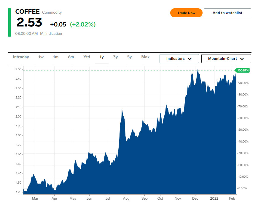 Marja xəbər verir ki, Dünyanın ən böyük "Arabica" qəhvə dənələri istehsalçısı olan Braziliyada əlverişsiz hava şəraiti, tədarük zəncirindəki problemlər, yükdaşıma və logistika xərclərinin artması səbəbindən "Arabica" qəhvəsinin qiyməti keçən il iki dəfə artıb.