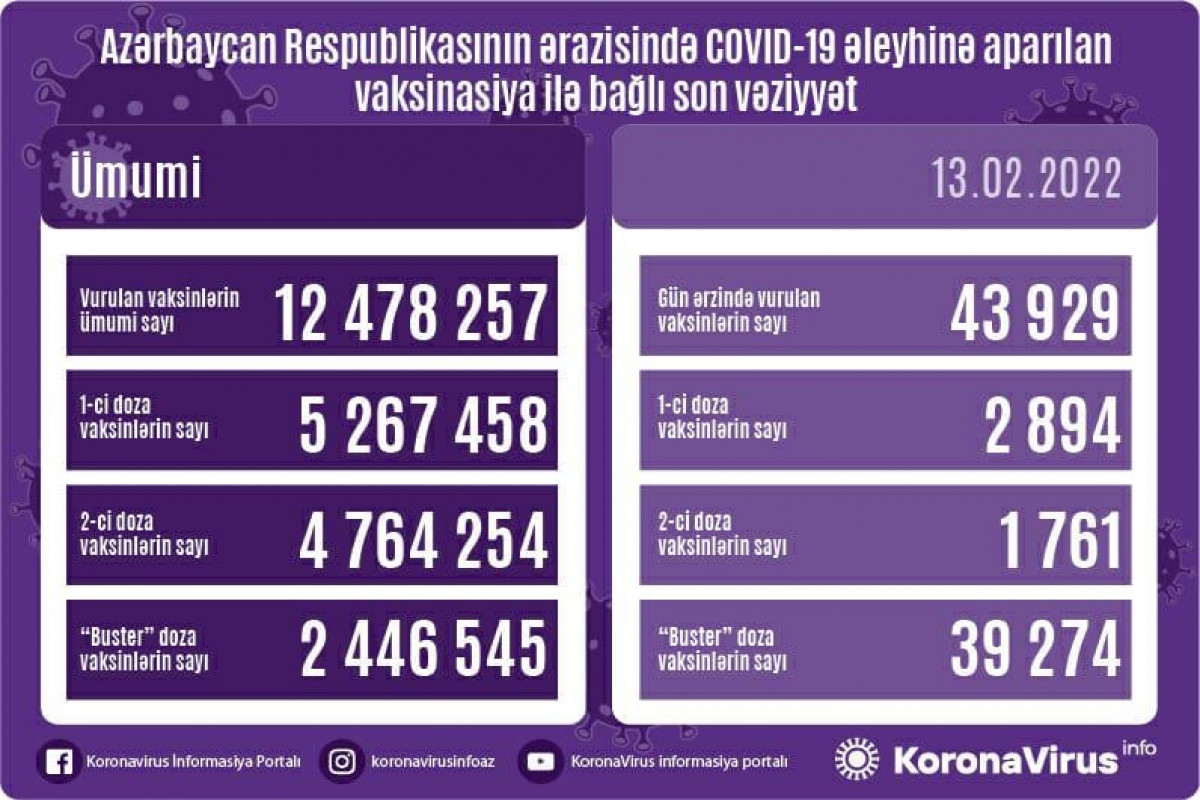 Azərbaycanda son sutkada koronavirus (COVID-19) əleyhinə 43 929 vaksin vurulub. Bir gündə birinci mərhələ üzrə vaksinasiya olunanların sayı 2 894, ikinci mərhələ üzrə vaksinasiya olunanların sayı 1 761, buster doza üzrə vaksinasiya olunanların sayı isə 39 274 nəfərdir.