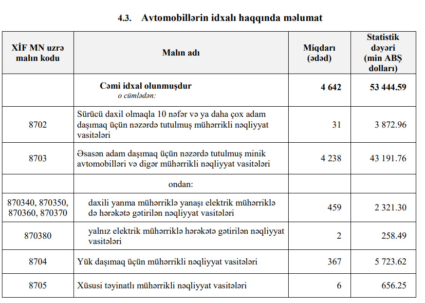2021-ci ilin Yanvar ayında Azərbaycana 53 milyon 445 min dollar dəyərində 4 min 642 ədəd avtomobil idxal edilmişdi.
