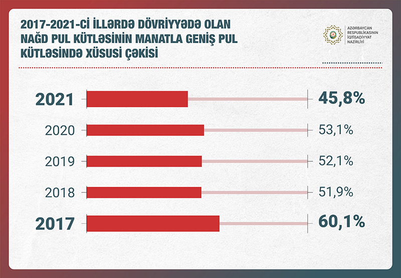 Azərbaycanda dövriyyədə olan nağd pul kütləsinin manatla geniş pul kütləsində xüsusi çəkisi 2017-ci ildəki 60,1%-dən 2021-ci ildə 45,8%-ə enib.