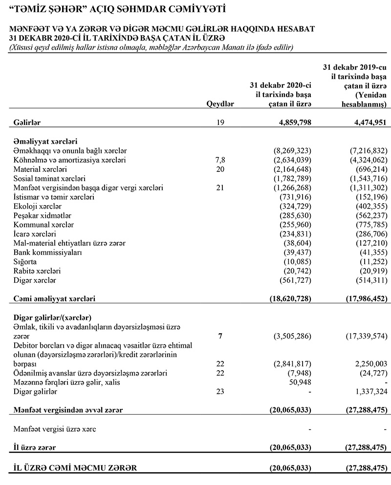 İqtisadiyyat Nazirliyinə məxsus "Təmiz Şəhər" ASC 2020-ci ili 20,065 milyon manat zərərlə başa vurub.