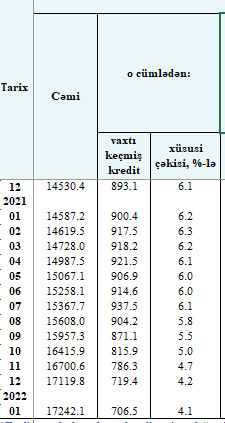 2022-ci ilin Yanvar ayının sonuna olan məlumata görə, 17 milyard 242 milyon manatlıq kredit qoyuluşlarının 706,5 milyon manatının ödəmə vaxtı keçib.