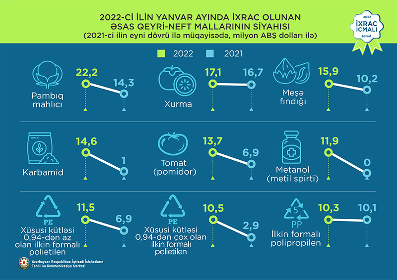 2022-ci ilin yanvar ayında ixrac edilən qeyri-neft sektoruna aid malların siyahısında pambıq mahlıcı (22,2 milyon ABŞ dolları) birinci, xurma (17,1 milyon ABŞ dolları) ikinci və meşə fındığı (15,9 milyon ABŞ dolları) üçüncü olub.