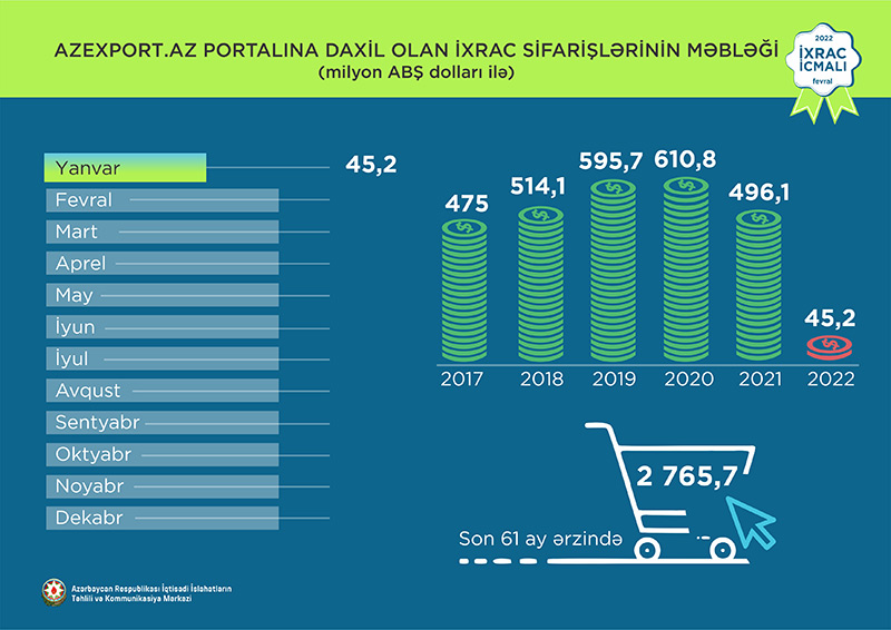 Marja xəbər verir ki, “İxrac icmalı” nın fevral sayına əsasən, 2022-ci ilin yanvar ayı ərzində Azərbaycanın ixracı 3,1 mlrd. ABŞ dolları, qeyri-neft sektoru üzrə 232,2 mln. ABŞ dolları təşkil edib. Qeyri-neft sektoru üzrə ixrac 2021-ci il ilə müqayisədə 86,2 mln. ABŞ dolları və ya 59% artıb.