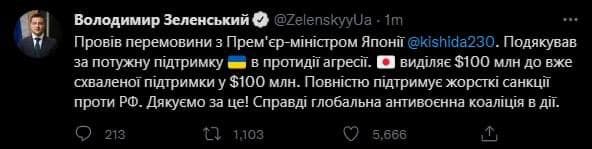 Prezident Vladimir Zelenki Yaponiyanın baş naziri Fumio Kişidaya göstərdiyi güclü dəstəyə görə təşəkkür edib.