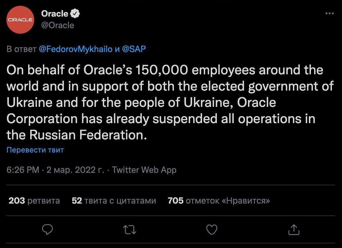 “Dünya üzrə 150 000 əməkdaşımız adından və Ukraynanın seçilmiş hakimiyyət orqanlarına və Ukrayna xalqına dəstək olaraq, Oracle artıq Rusiya Federasiyasındakı bütün əməliyyatlarını dayandırıb”, - deyə şirkətin Twitter səhifəsində bildirilib.