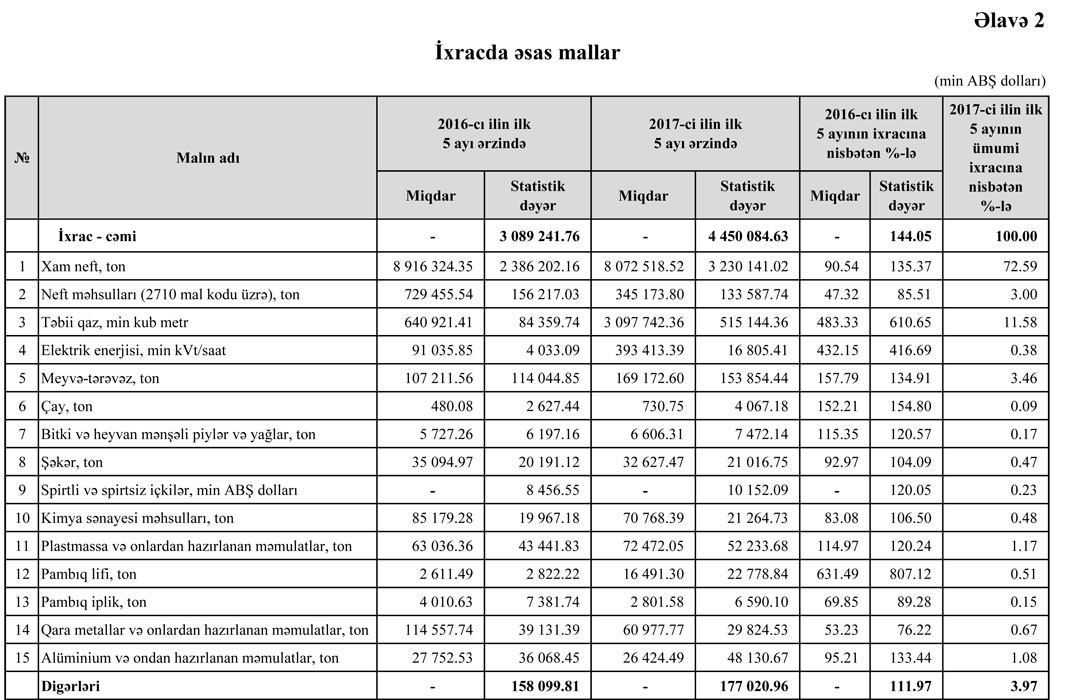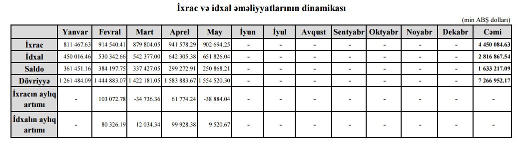 Mayda Azərbaycanın ixracı 902 milyon 694.25 min dollar, idxalı isə 651 milyon 826.04 min dollar, saldo 250 milyon 868.21 min dollar təşkil edib. Mayda Aprel ayı ilə müqayisədə Azərbaycanın ixracı 38 milyon 884 min dollar azalıb, idxalı isə 9 milyon 521 min dollar artıb.