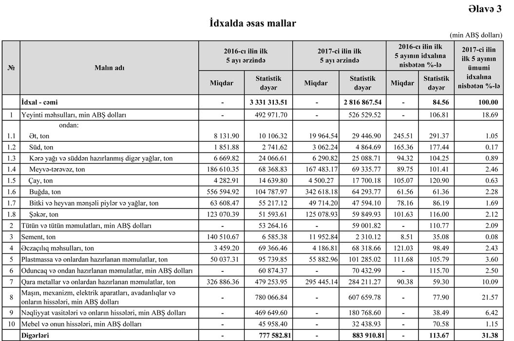 2017-ci ilin Yanvar-May aylarında Azərbaycanın ticarət əməliyyatlarının həcmi 7 milyard 266 milyon 952.17 min ABŞ dolları təşkil edib.