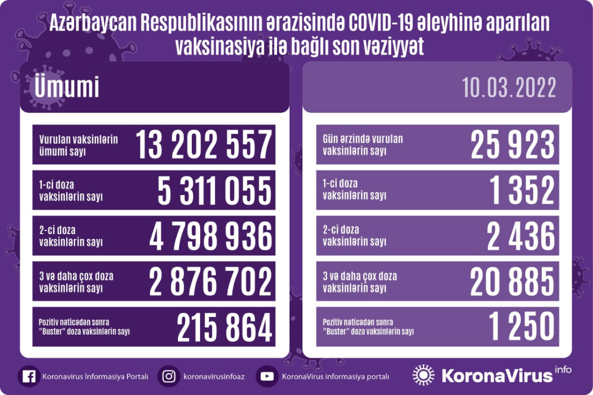 Azərbaycanda son sutkada koronavirus (COVID-19) əleyhinə 25 923 vaksin vurulub. Bir gündə birinci mərhələ üzrə vaksinasiya olunanların sayı 1352, ikinci mərhələ üzrə vaksinasiya olunanların sayı 2436, 3-cü və daha çox doza üzrə vaksinasiya olunanların sayı 20 885, pozitiv nəticədən sonra buster doza olunanların sayı isə 1250 nəfərdir.
