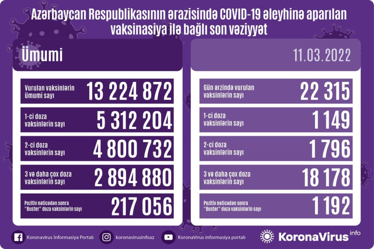 Nazirlər Kabineti yanında Operativ Qərargahdan verilən məlumata görə, bir gündə birinci mərhələ üzrə vaksinasiya olunanların sayı 1149, ikinci mərhələ üzrə vaksinasiya olunanların sayı 1796, 3-cü və daha çox doza üzrə vaksinasiya olunanların sayı 18 178, pozitiv nəticədən sonra buster doza olunanların sayı isə 1192 nəfərdir.