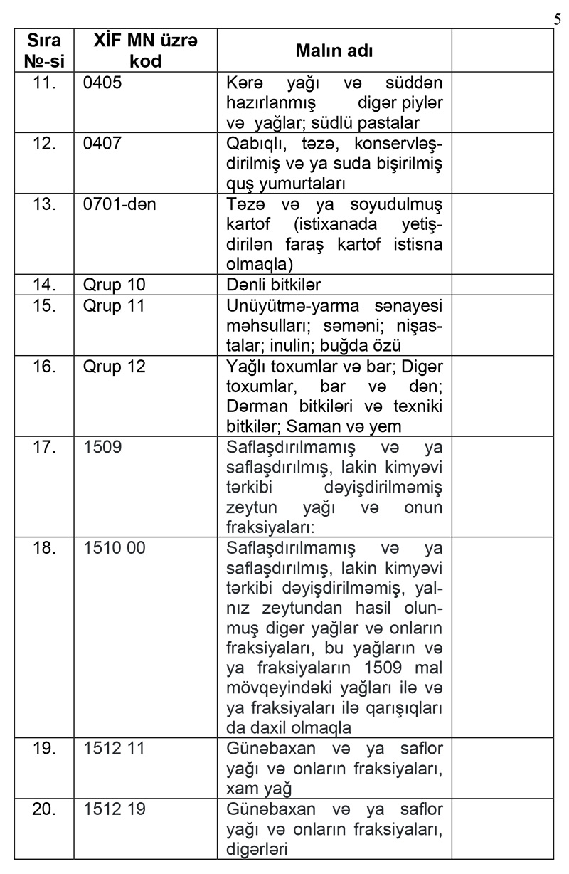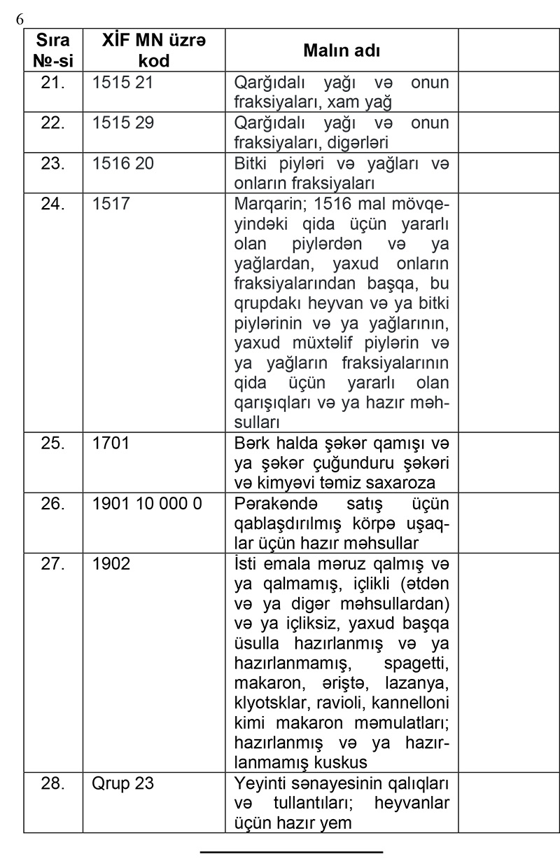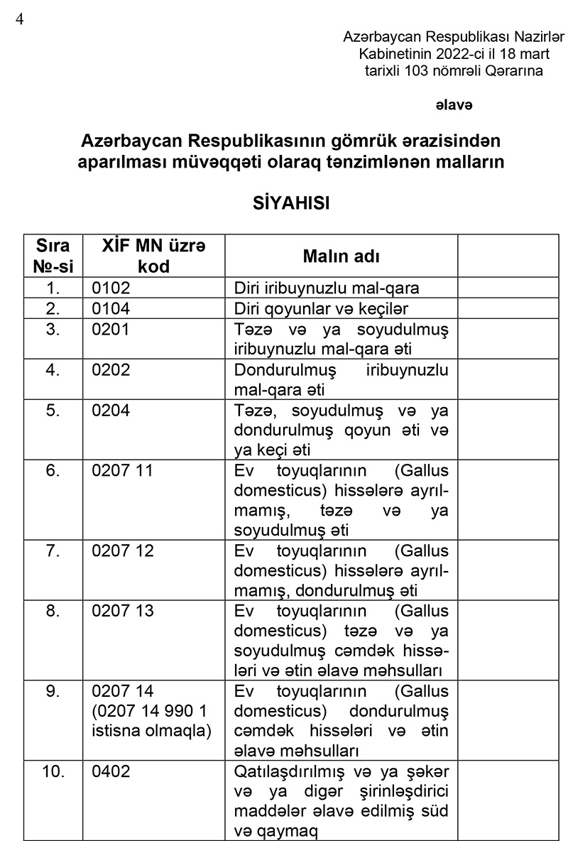 Qeyd edək ki, Azərbaycandan aparılması müvəqqəti olaraq məhdudlaşdırılan mallara - diri iribuynuzlu mal-qara, mal-qara əti, ev toyuqları, ev toyuqlarının əti, qatılaşdırılmış süd, kərə yağı, dənli bitkilər, zeytun yağı, günəbaxan yağı, qarğıdalı yağı, şəkər, spagetti, makaron və s. daxildir.
