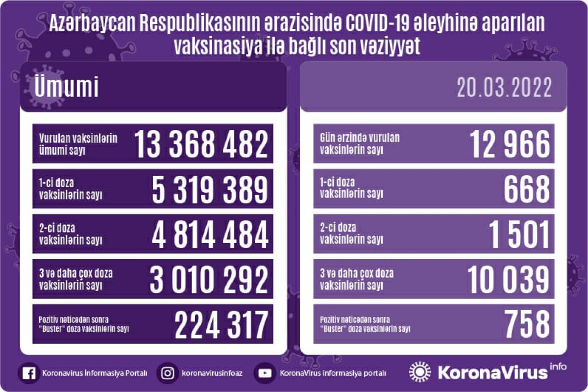 Azərbaycanda son sutkada koronavirus (COVID-19) əleyhinə 12 966 vaksin vurulub. Bir gündə birinci mərhələ üzrə vaksinasiya olunanların sayı 668, ikinci mərhələ üzrə vaksinasiya olunanların sayı 1 501, üç və daha çox doza üzrə vaksinasiya olunanların sayı 10 039, pozitiv nəticədən sonra buster doza üzrə vaksinasiya olunanların sayı 758 nəfərdir.