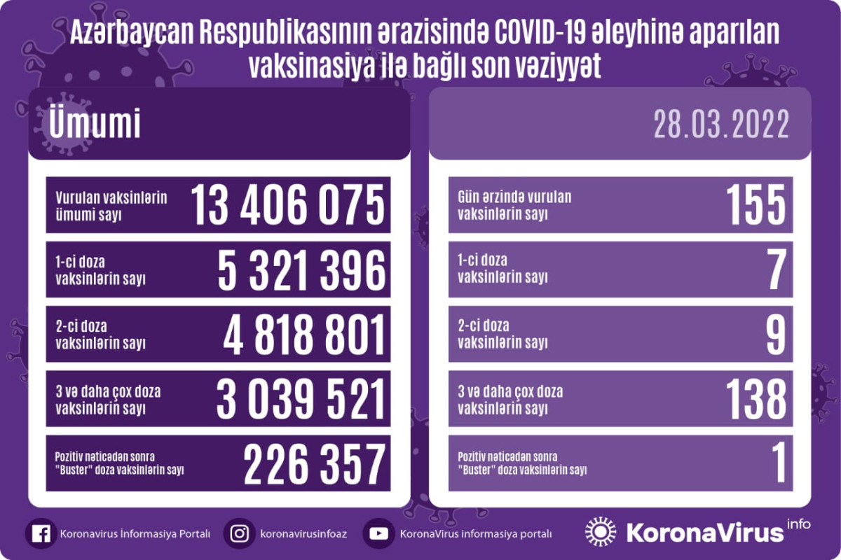 Azərbaycanda son sutkada koronavirus (COVID-19) əleyhinə 155 vaksin vurulub. Bir gündə birinci mərhələ üzrə vaksinasiya olunanların sayı 7, ikinci mərhələ üzrə vaksinasiya olunanların sayı 9, üç və daha çox doza üzrə vaksinasiya olunanların sayı 138, pozitiv nəticədən sonra buster doza üzrə vaksinasiya olunanların sayı 1 nəfərdir.