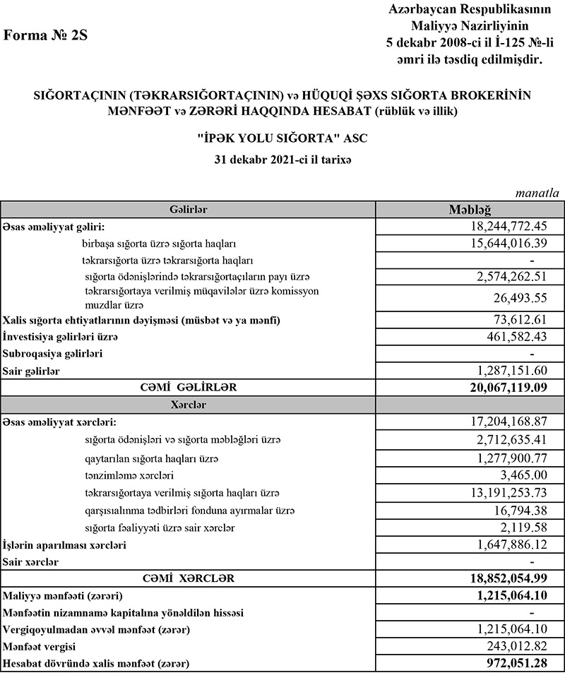 2020-ci ildə “İpək Yolu Sığorta”nın topladığı sığorta haqları 17 milyon 320 min manat, sığorta ödənişləri isə isə 2 milyon 649 min manat, təkrarsığorta üzrə xərcləri isə 14 milyon 513 min manat təşkil etmişdi.