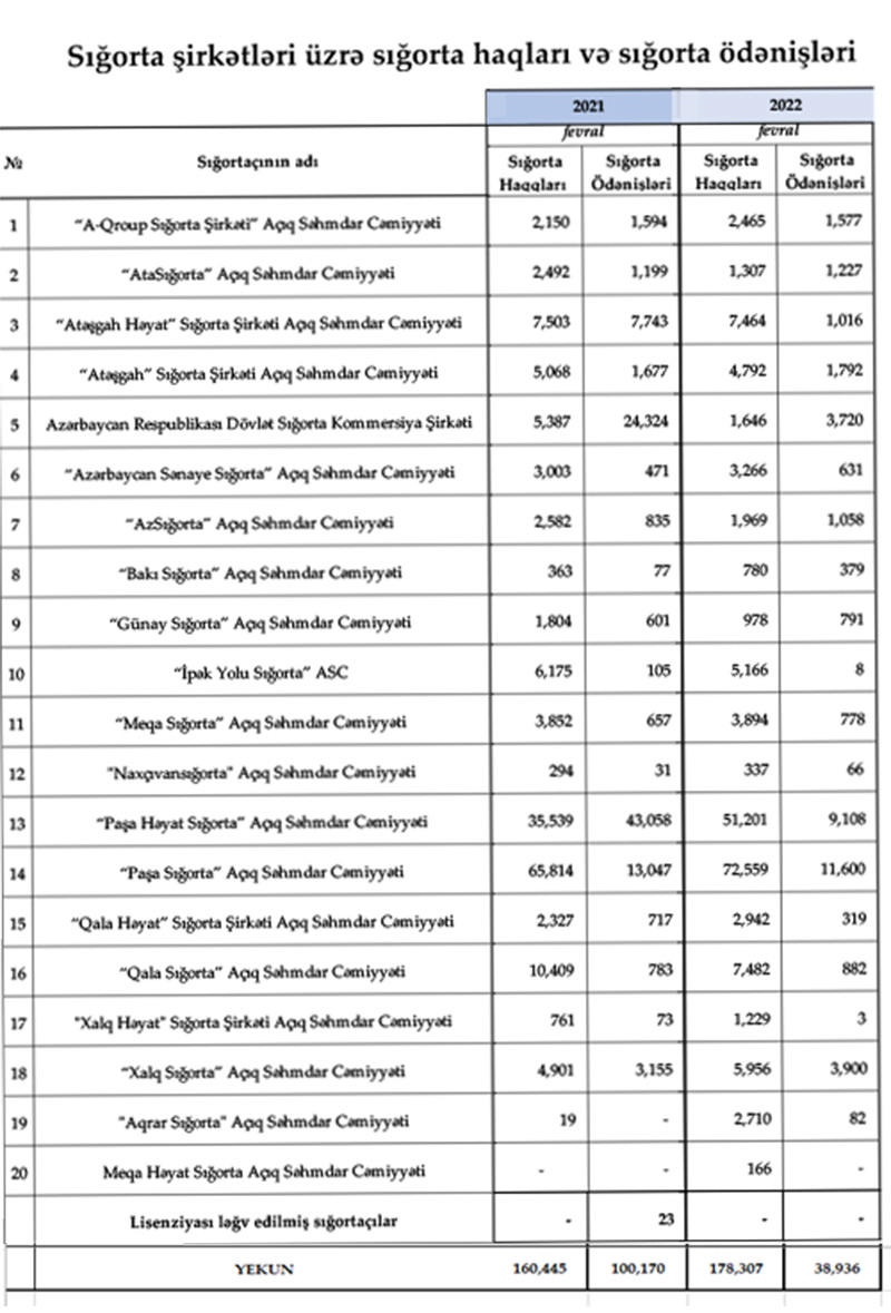 2022-ci ilin yanvar-fevral dövründə sığorta şirkətləri tərəfindən hesablanmış sığorta haqları və sığorta ödənişləri.