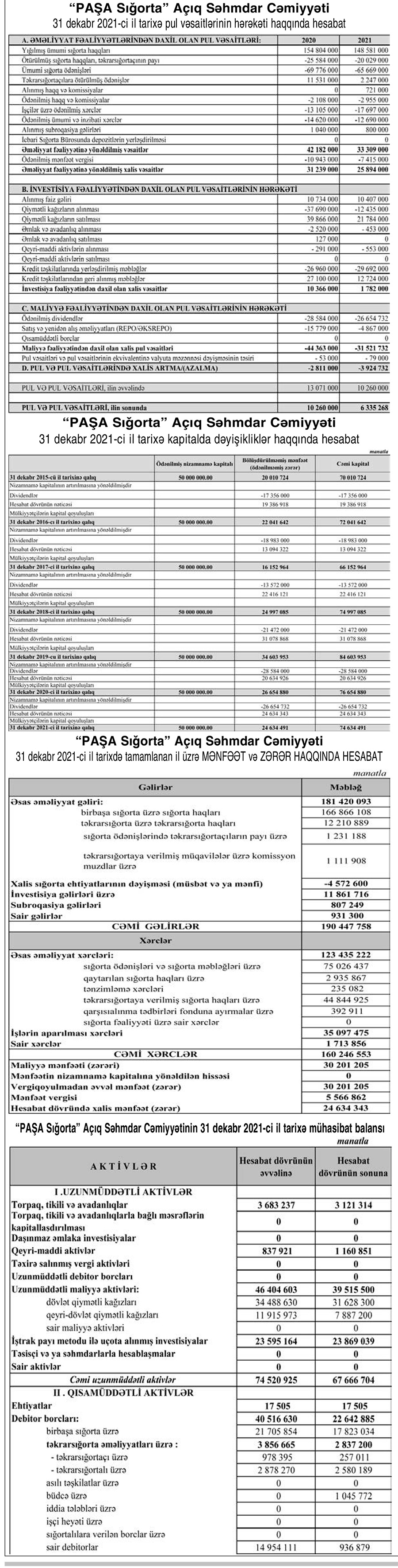 2020-ci ildə "PAŞA Sığorta"nın hesabladığı sığorta haqları 154 milyon 654 min min manat ikən, 2021-ci ildə 166 milyon 866 min manata yüksəlib.
