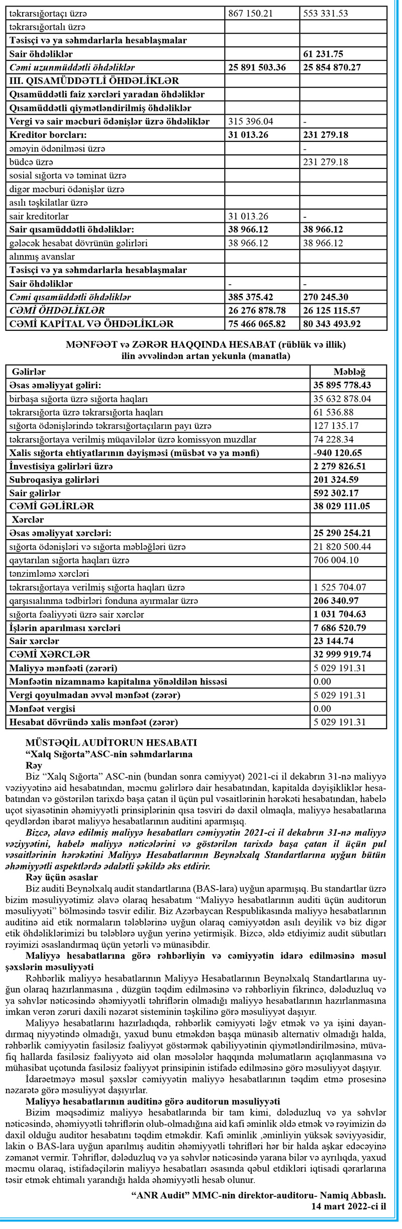 Xatırladaq ki, “Xalq Sığorta” Şirkəti 2020-ci ili 8 milyon 61 min manat xalis mənfəət ilə bağlamışdı. Xalis mənfəətin azalması sığorta ehtiyatına ayrılan vəsait və sığorta ödənişlərinin artması ilə əlaqədardır.