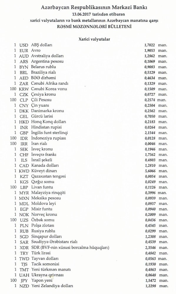İyunun 13-nə Mərkəzi Bankın açıqladığı rəsmi Dollar/manat məzənnəsi İyunun 12-si ilə müqayisədə dəyişməyərək 1,7022 manat olub, Avro/manat məzənnəsi də 1.9053 manada düşüb.