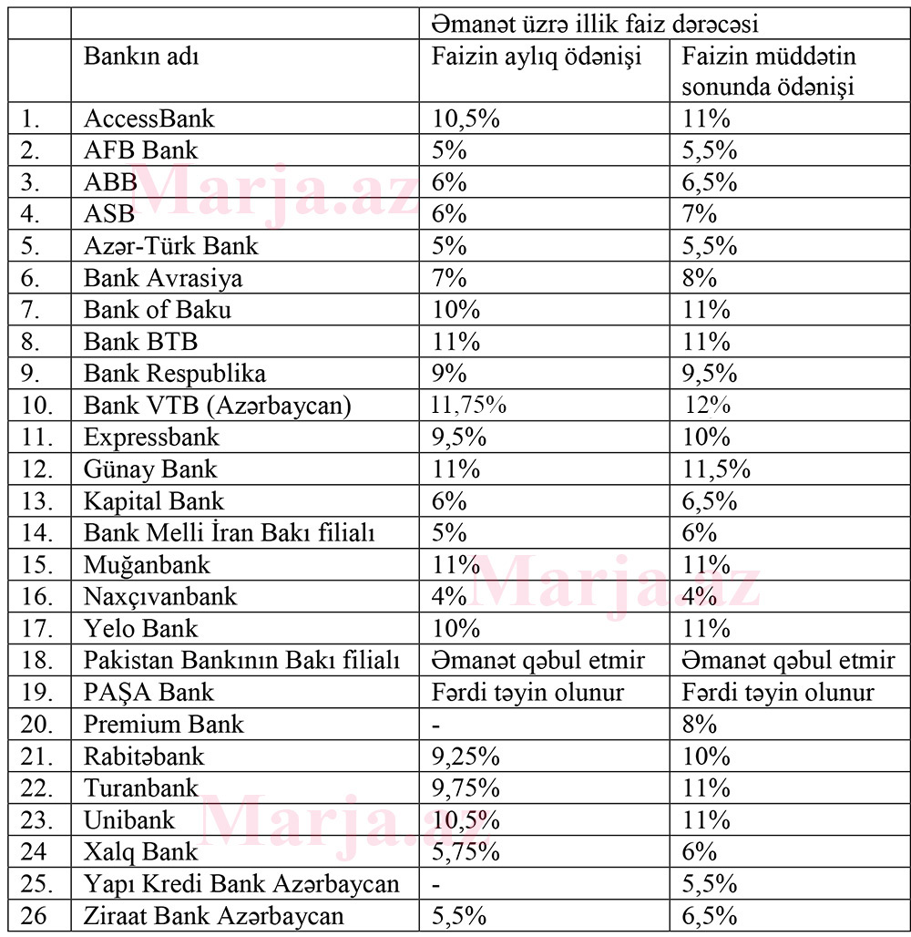 Belə ki, AZN əmanəti1 il müddətinə Bankda yerləşdirilməlidir. Faiz dərəcəsi 11,25% + 0,5% (faizlər hər ay ödənildikə) və 11,5% + 0,5% (faizlər müddətin sonunda ödənildikdə) nəzərdə tutulub.