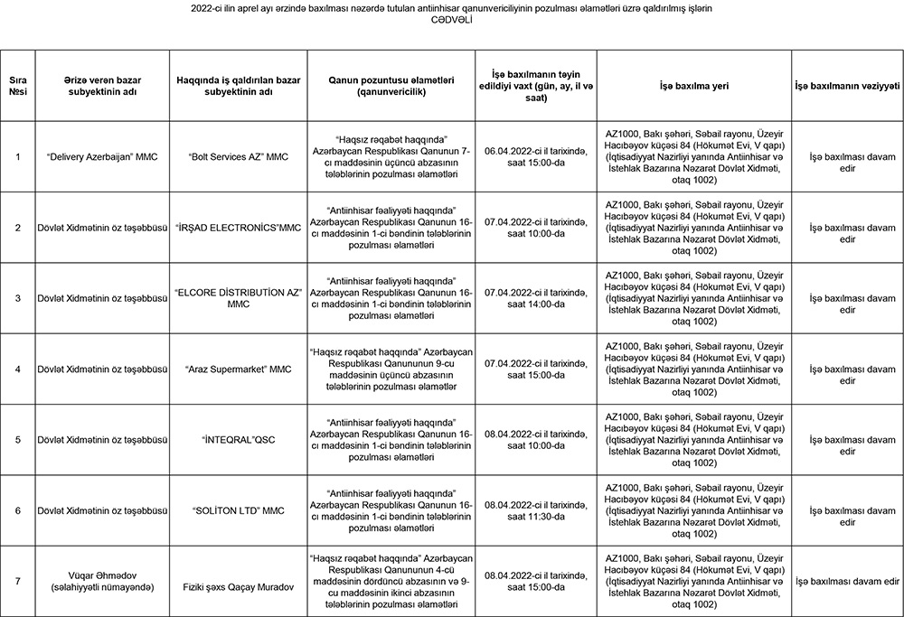 Digər təsərrüfat subyektləri üzrə işə baxılmasının nəticələri barədə məlumat veriləcək və Dövlət Xidmətinin rəsmi internet səhifəsində (https://competition.gov.az/az/page/melumat-merkezi/faydali/baxilacaq-islerin-cedveli.) yerləşdiriləcəkdir.