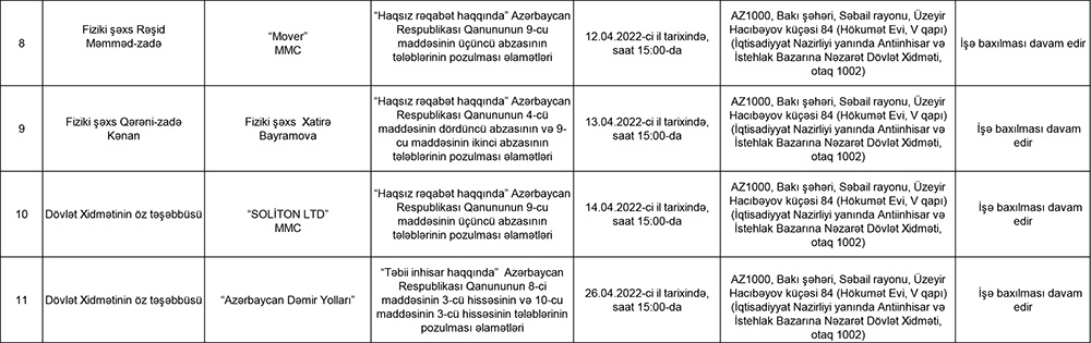 “IRŞAD ELECTRONİCS” MMC, “İnteqral” QSC, “Soliton LTD” MMC və “ELCORE DİSTRİBUTİON AZ” MMC tərəfindən sorğuda tələb olunan sənəd və məlumatlar təqdim edilmədiyi üçün həmin təsərrüfat subyektləri barəsində iş qaldırılıb.