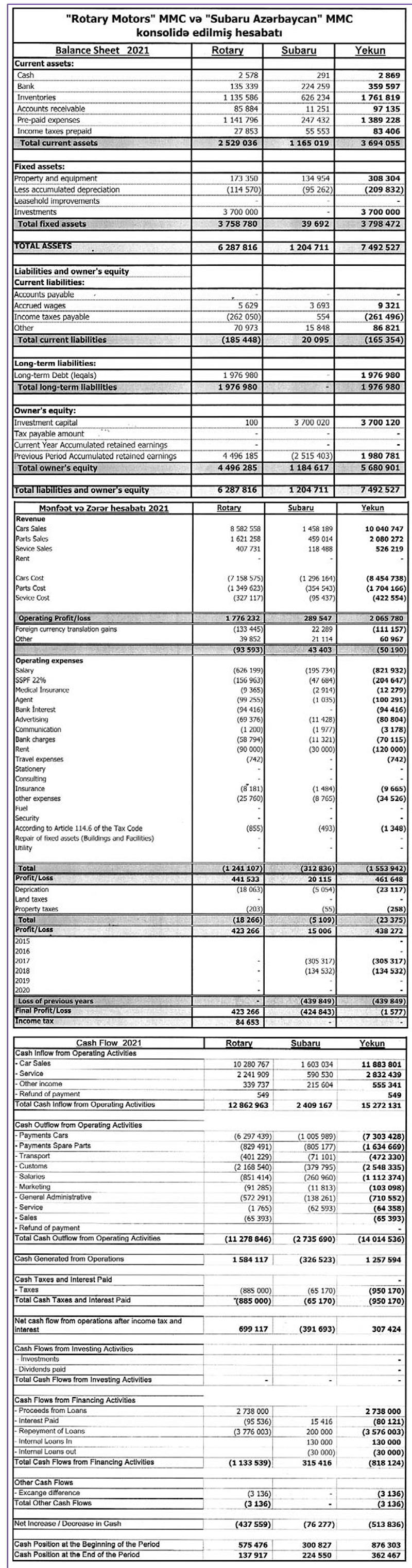 Azərbaycanda Mazda avtomobillərinin rəsmi idxalçısı “Rotary Motors” MMC və Subaru avtomobillərinin rəsmi idxalçısı “Subaru Azərbaycan” MMC konsolidə edilmiş hesabat dərc etdiriblər.
