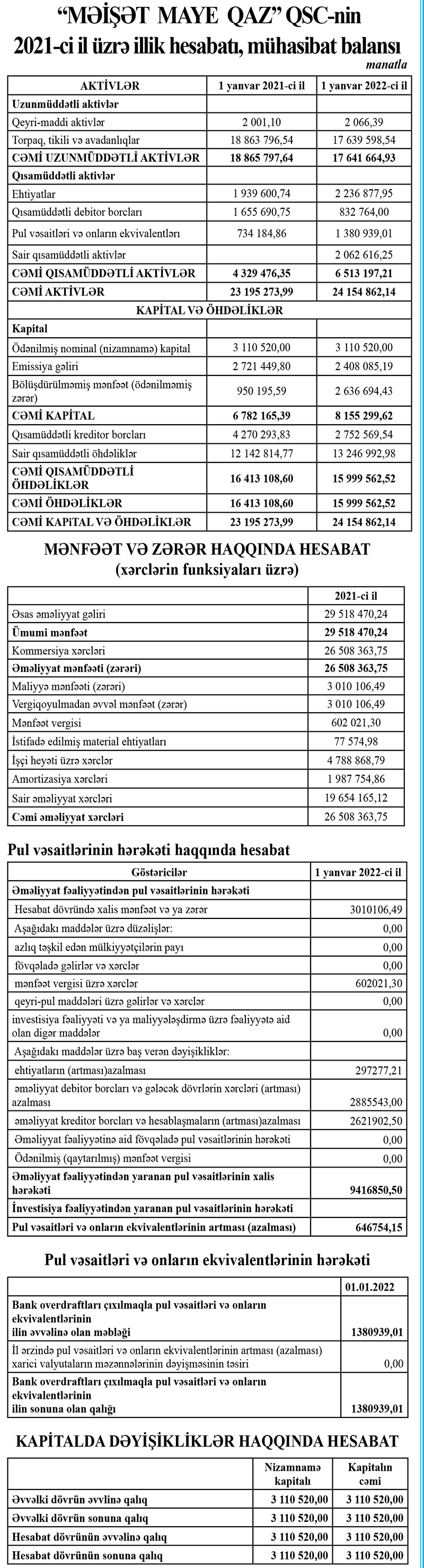 Xatırladaq ki, 2020-ci ildə “Məişət Maye Qaz” şirkətinin cəmi əməliyyat gəlirləri 25 milyon 173 min manat, cəmi əməliyyat xərcləri 21 milyon 771 min manat, əməliyyat mənfəəti 3 milyon 402 min manat, ödənilmiş mənfəət vergisi 680 min manat təşkil etmişdi.