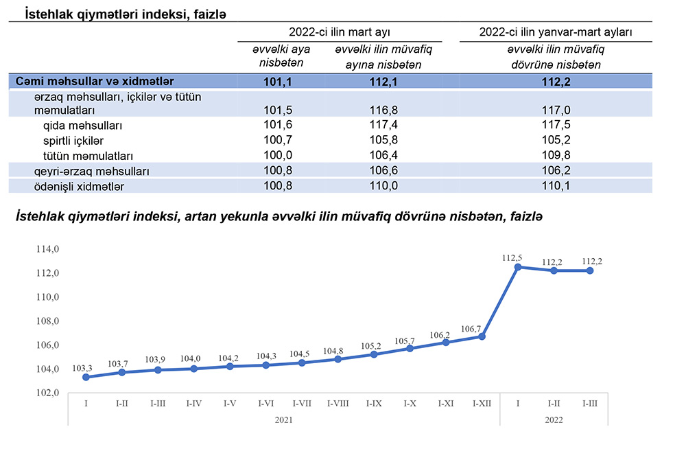 Xatırladaq ki, 2022-ci ilin yanvar-fevral aylarında istehlak qiymətləri indeksi 2021-ci ilin yanvar-fevral aylarına nisbətən 12,2 faiz, o cümlədən ərzaq məhsulları, içkilər və tütün məmulatları üzrə 17,2 faiz, qeyri-ərzaq məhsulları üzrə 106,0 faiz, əhaliyə göstərilmiş ödənişli xidmətlər üzrə 10,2 faiz artmışdı. Cari ilin fevral ayında istehlak qiymətləri indeksi əvvəlki aya nisbətən 1,1 faiz, əvvəlki ilin fevral ayına nisbətən 11,9 faiz yüksəlmişdi.