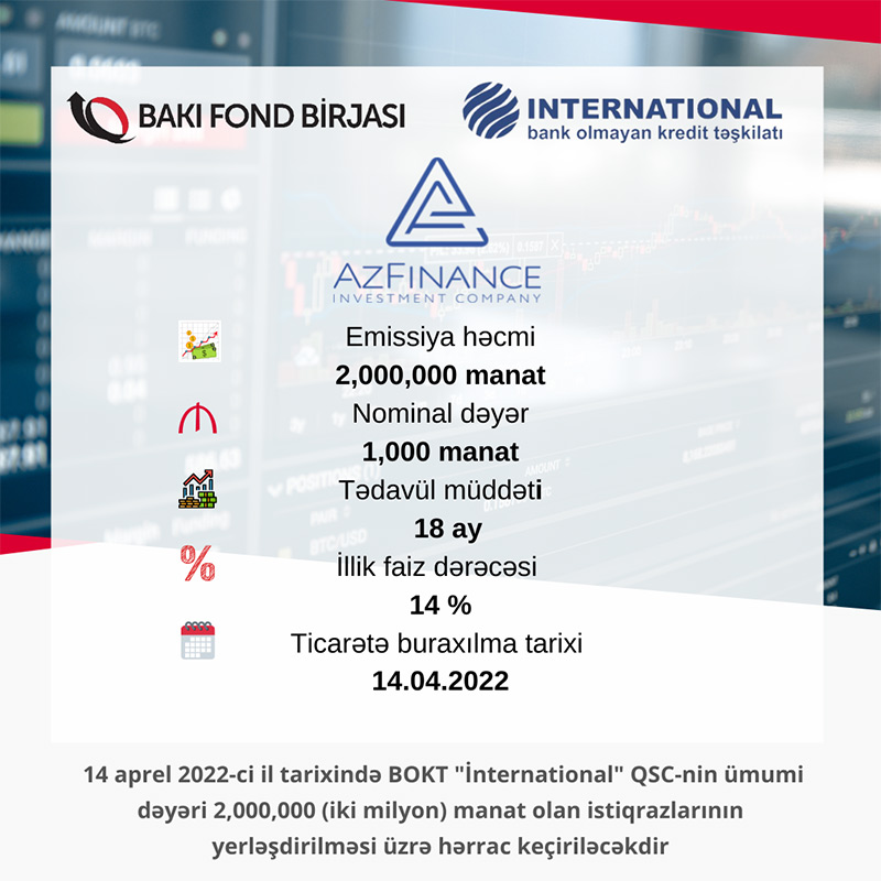 Birjanın yaydığı məlumata görə, 14 aprel 2022-ci il tarixində BOKT "İnternational" QSC-nin istiqrazlarının yerləşdirilməsi Bakı Fond Birjasında birqiymətli hərrac üsulu ilə həyata keçiriləcəkdir.