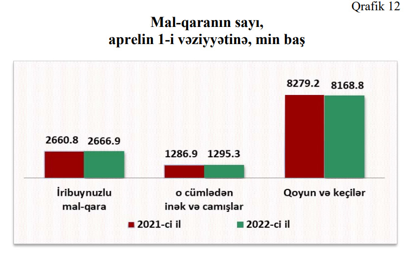 2022-ci il aprelin 1-i vəziyyətinə ölkə üzrə 8168,8 min baş qoyun və keçi, 2666,9 min baş iribuynuzlu mal-qara, o cümlədən 1295,3 min baş inək və camış, 5952 baş donuz mövcud olmuşdur.İribuynuzlu mal-qaranın 48,6 faizini inək və camışlar təşkil edir.