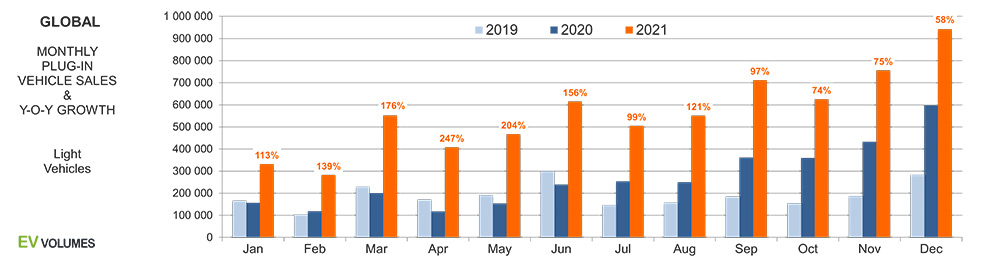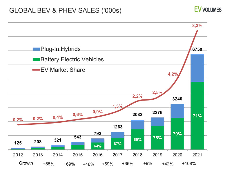 Marja.az "EV-volumes.com" saytının məlumatlarına istinadən xəbər verir ki, 2021-ci ildə qlobal elektrikli avtomobil satışları əvvəlki ilə nisbətən 108 faiz artaraq 6,75 milyon ədəd təşkil edib. Pandemiyaya baxmayaraq 2020-ci ildə elektrikli avtomobil satışı 3,24 milyon ədəd olmuşdu.