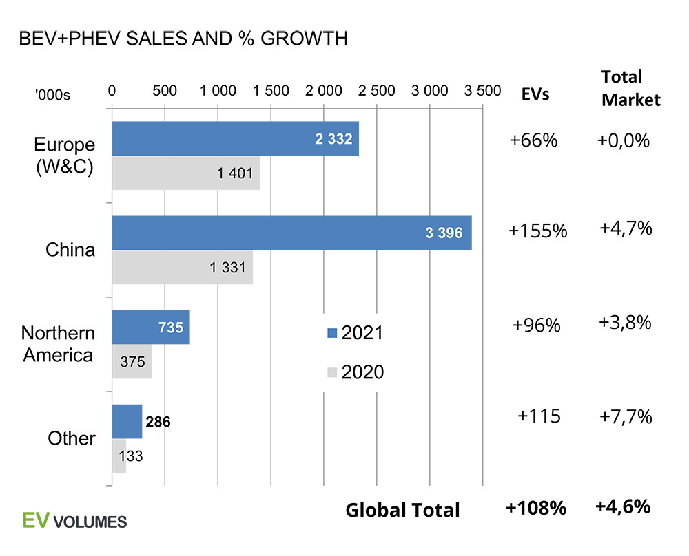 Avropada 2,3 milyon elektrikli avtomobil satılıb, bu rəqəm 2020-ci ilə nisbətən 66 faiz artıb. ABŞ 735 min elektrikli avtomobil satışı ilə üçüncü yerdə olarkən, Cənubi Koreyada 114 min 500 ədəd elektrikli avtomobil satılıb. Elektrikli vasitə satışı İsrail, Avstraliya, Hindistan və Yaponiyada 10 mini keçib.