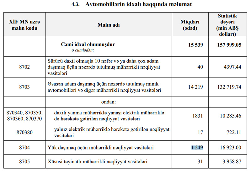 2022-ci ilin ilk 3 ayında (1-ci rübdə) Azərbaycana 189 milyon 355 min dollar dəyərində 17 min 102 ədəd nəqliyyat vasitəsi (avtomobi) idxal edilib.