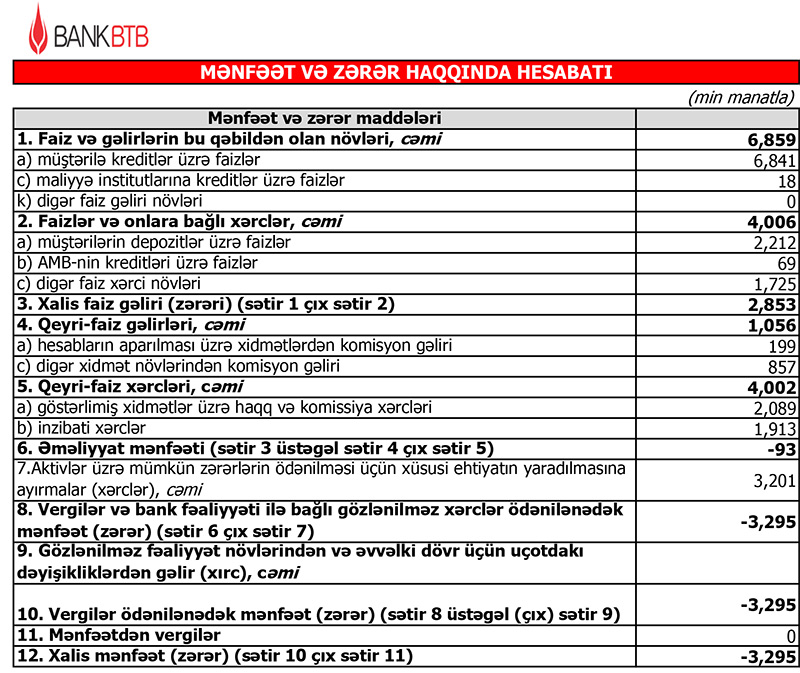 2022-ci ilin yanvar-mart dövründə “Bank BTB”aktivlər üzrə mümkün zərərlərin ödənilməsi üçün xüsusi ehtiyatın yaradılmasına 3 milyon 201 min manat ayırdığından zərər 3 milyon 295 min manata yüksəlib. Qeyd edək ki, ehtimal olunan kredit və depozit itkiləri üzrə ehtiyatlara ayırma qanunvericiliyə əsasən həyata keçirilir, "təhlükəsizlik yastığı" olan bu ehtiyatlar bankın stabil fəaliyyətini təmin etməyə kömək edir.