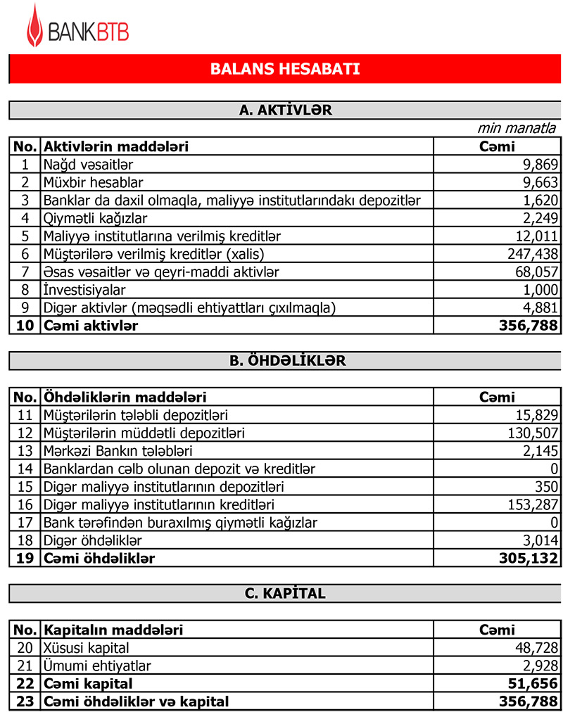 2021-ci ilin birinci rübün sonuna Bank BTB-nin cəmi aktivləri 336 milyon 735 min manat, kredit portfeli isə 222 milyon 350 min manat təşkil etmişdi. Beləlikl, Bank son 12 ayda böyüyüb (aktivləri 6%, kredit portfeli 11,2% artıb )