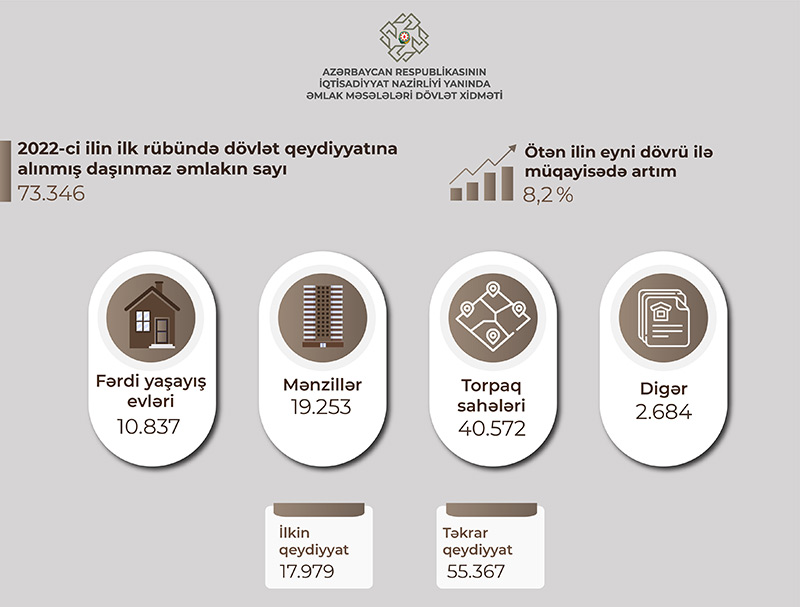 2022-ci ilin ilk rübü ərzində 3.712 fərdi yaşayış və bağ evi ilkin dövlət qeydiyyatına alınıb. 2021-ci ilin eyni dövrü ilə müqayisədə ilkin qeydiyyata alınan fərdi yaşayış və bağ evlərinin sayı 10,9% artıb. Analoji hal torpaq sahələrinin ilkin qeydiyyatında da müşahidə edilib. Belə ki, ötən ilin müvafiq dövrü ilə müqayisədə torpaq sahələrinin ilkin qeydiyyatı 2,6 dəfə artaraq 9.191 olub.