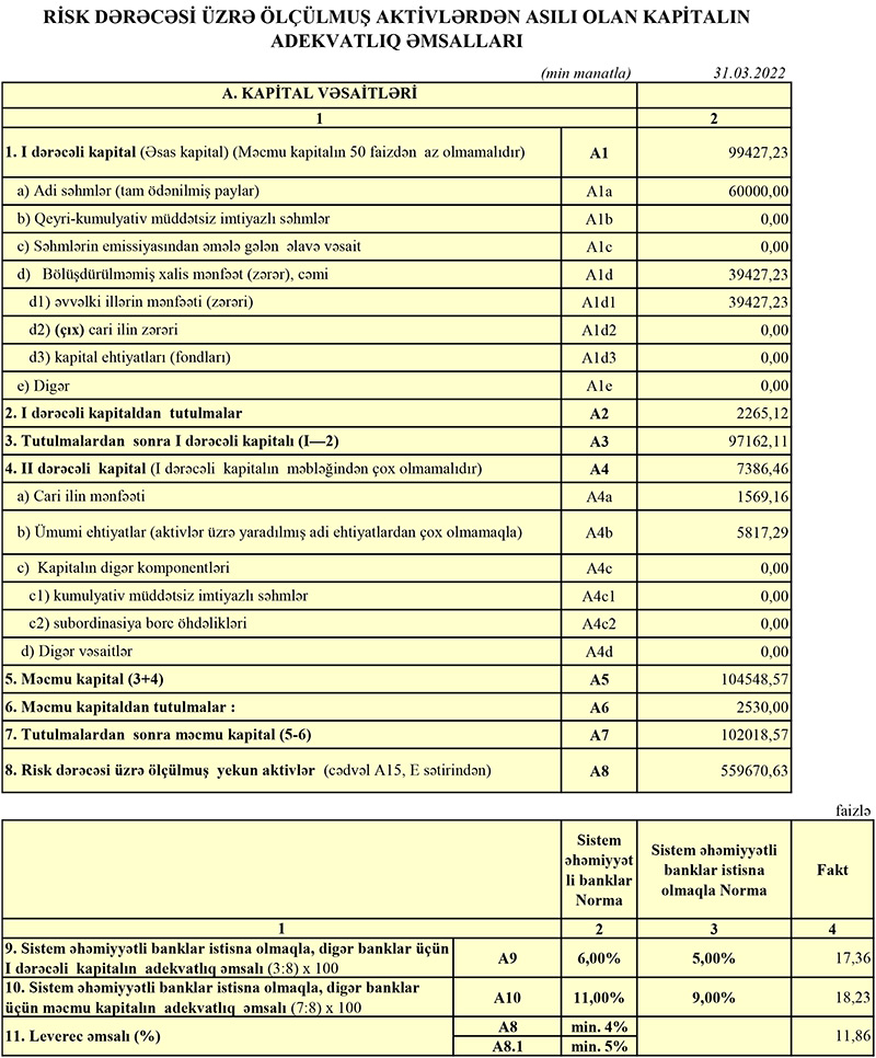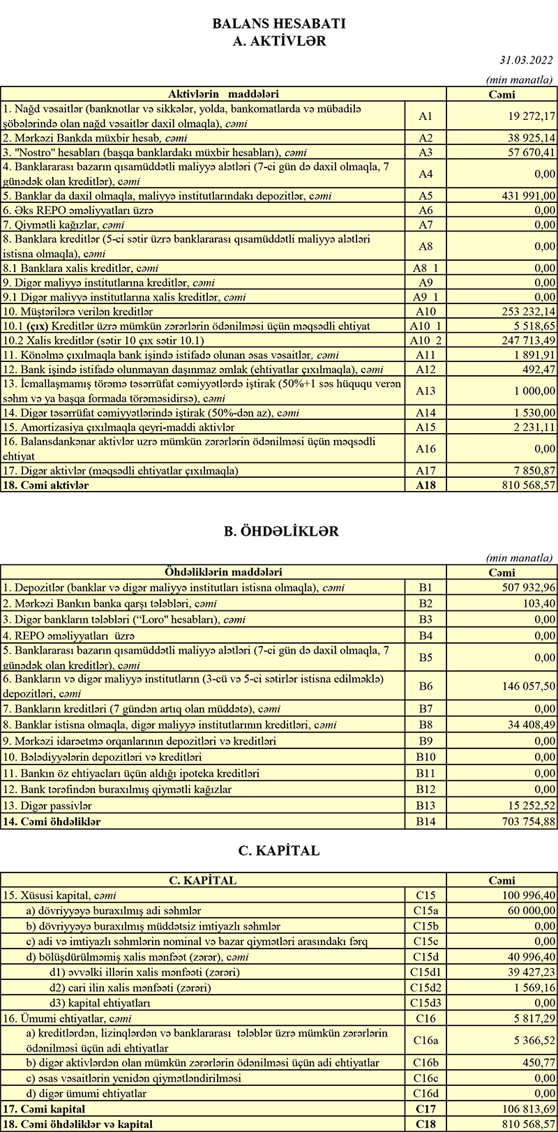 Ötən ilin sonunda Bankın depozit portfeli 514 milyon 382 min manat ikən, 31 Mart 2022-ci il tarixində 507 milyon 933 min manat təşkil edib.