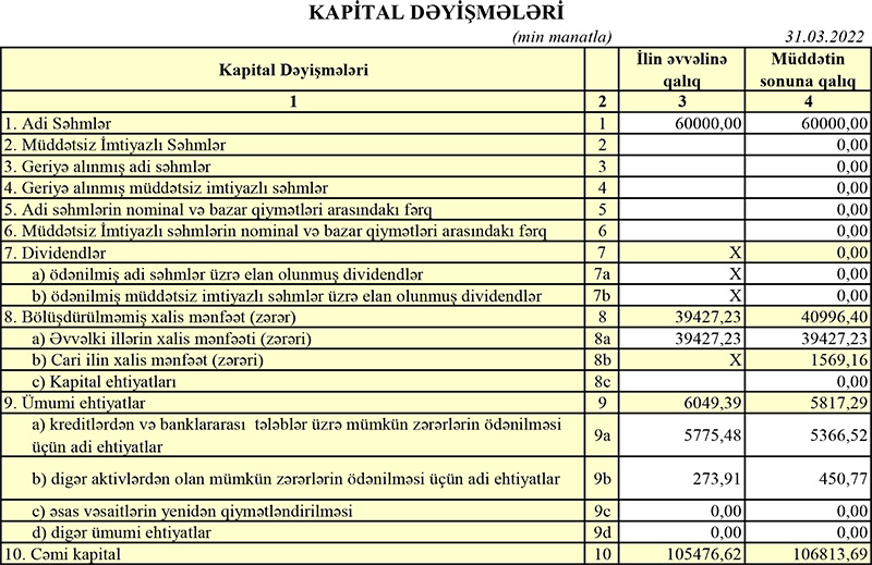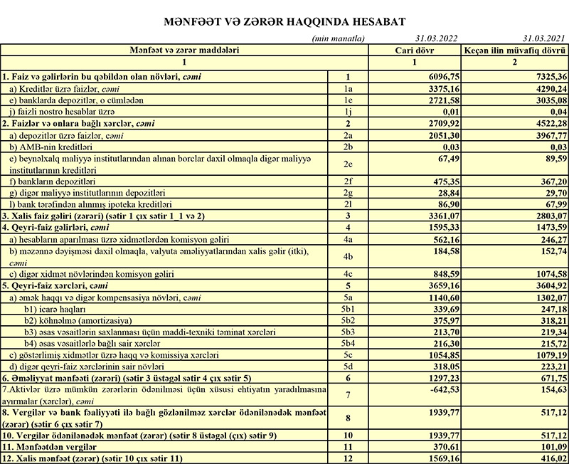 Bankın faizlər və onlara bağlı xərcləri 2021-ci ilin ilk rübündəki 4 milyon 522 min manatdan 2022-ci ilin ilk rübündə 2 milyon 710 min manata düşüb.
