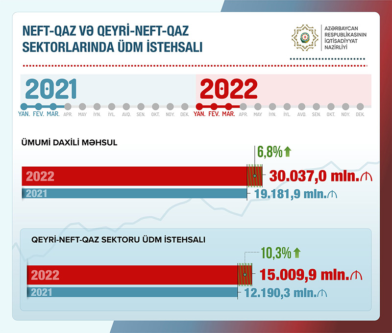 "Qeyri-neft-qaz sektoru üzrə ümumi daxili məhsul (ÜDM) ötən ilin ilk rübü ilə müqayisədə rekord həddə - 10,3% artaraq 15 milyard 9,9 milyon manata çatıb".