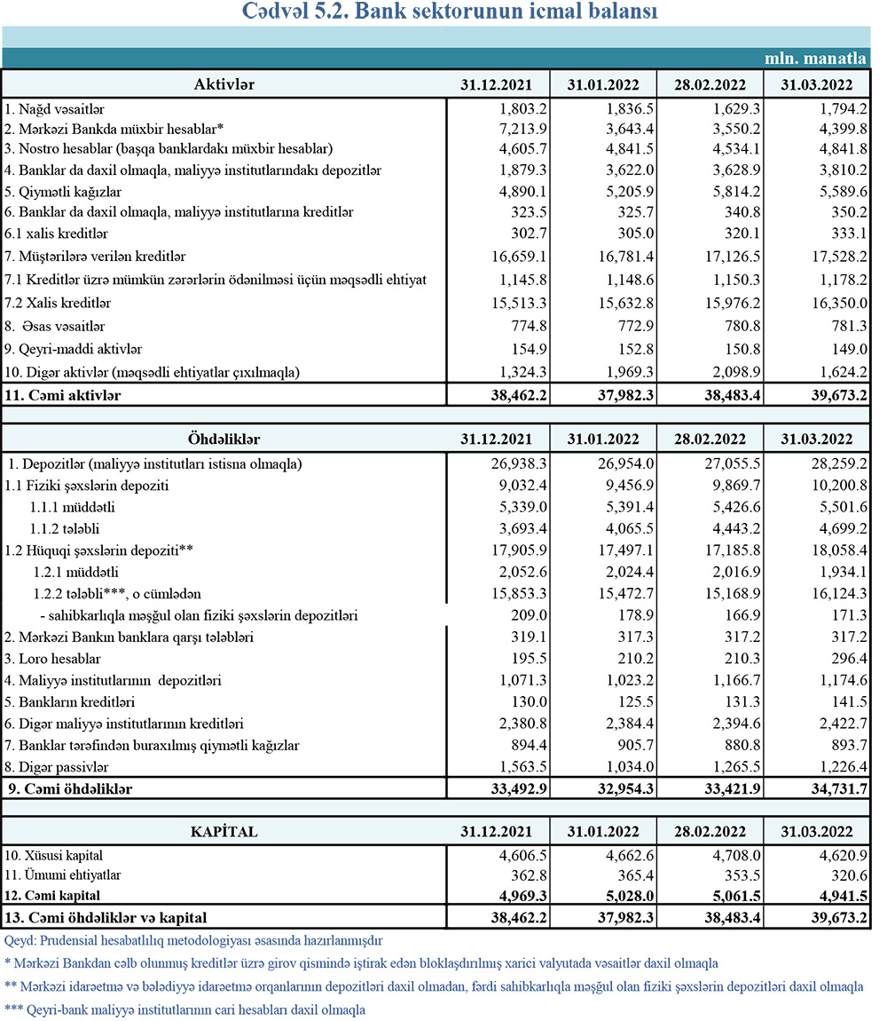 Mart ayında müddətli depozitlər 75 milyon manat artaraq 5 milyard 501,6 milyon manata, tələbli depozitlər isə 256,2 milyon manat artaraq 4 milyard 699,2 milyon manata çatıb.