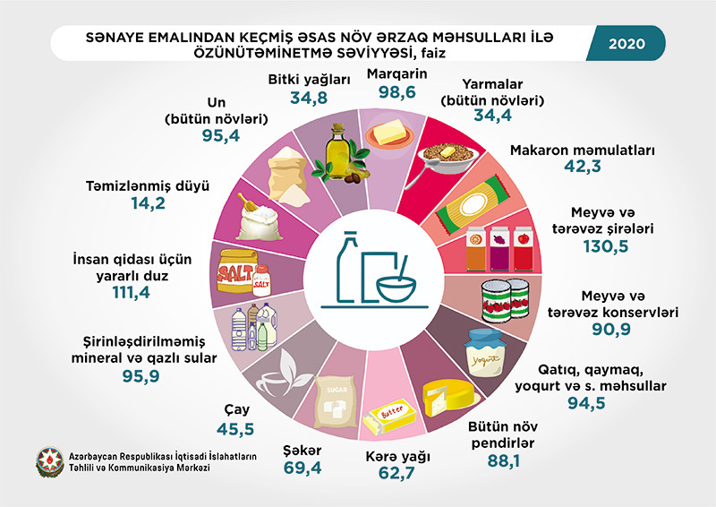 İqtisadi İslahatların Təhlili və Kommunikasiya Mərkəzi Azərbaycanın bitkiçilik, heyvandarlıq və sənaye emalından keçmiş əsas növ ərzaq məhsulları ilə özünütəminetmə səviyyəsini araşdırıb.