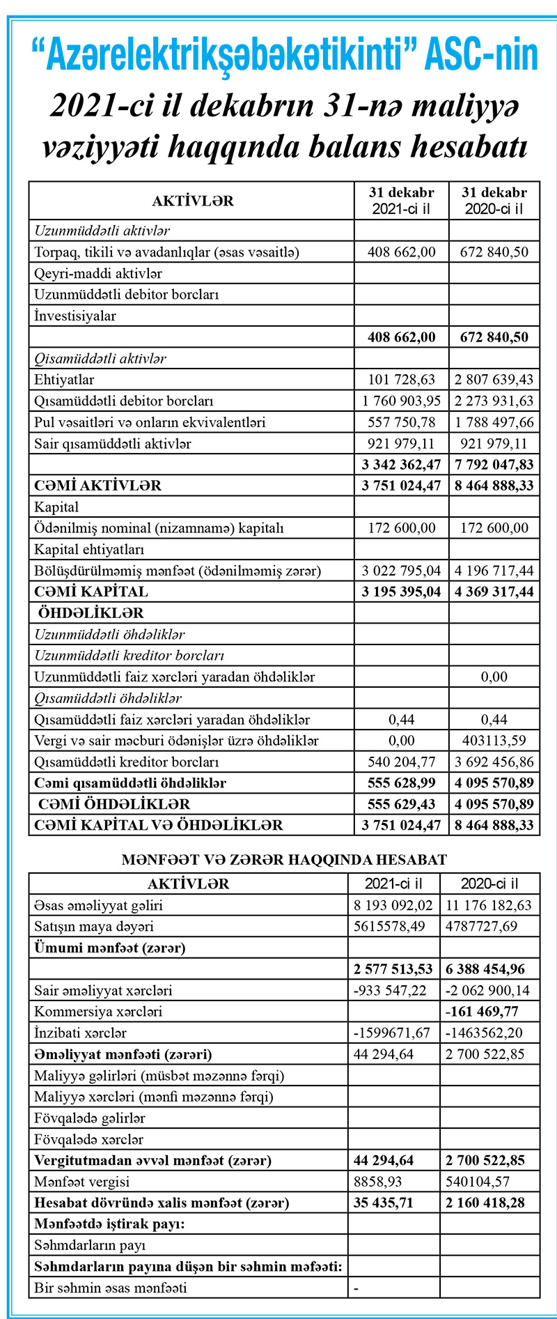 “Azərelektrikşəbəkətikinti” ASC 2021-ci ili 35 min 436 manat xalis mənfəət ilə başa vurub. Şirkət 2020-ci ili 2 milyon 160 min 418 manat xalis mənfəət ilə bağlamışdı. Beləliklə, 2020-ci illə müqayisədə 2021-ci ildə “Azərelektrikşəbəkətikinti”nin xalis mənfəəti 61 dəfə azalıb.