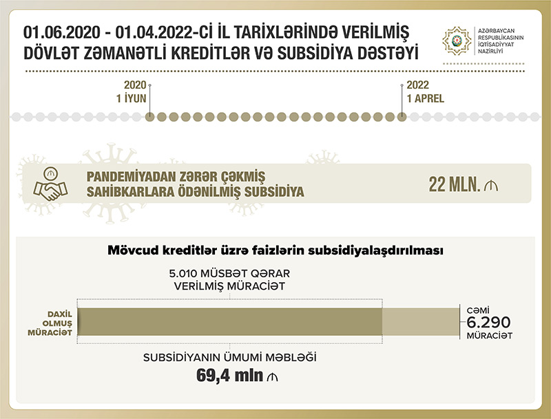 2020-ci il iyun ayından bu il aprelin 1-dək dövlət zəmanətli kredit və subsidiya dəstəyi layihəsi çərçivəsində pandemiyadan zərər çəkmiş sahibkarlara 22 milyon manat subsidiya ödənilib.