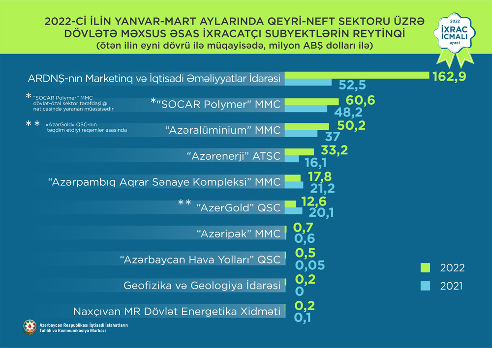 2022-ci ilin yanvar-mart ayları üzrə hazırlanan qeyri-dövlət ixracatçı subyektlərin reytinqində ilk onluqda aşağıdakı şirkətlər təmsil olunurlar: “MKT İstehsalat Kommersiya” MMC, “Azərbaycan İnterneyşnl Mayninq Kompani Limited Şirkəti”nin Azərbaycan Respublikasındakı Nümayəndəliyi, “P-Aqro” MMC, “Aqrovest” MMC, “Çinar Aqro” MMC, “Mors Trading” MMC, “STP Alüminium” MMC, “Product Service” MMC, “ZR-78 Company” MMC, “Azərbaycan Şəkər İstehsalat Birliyi” MMC.