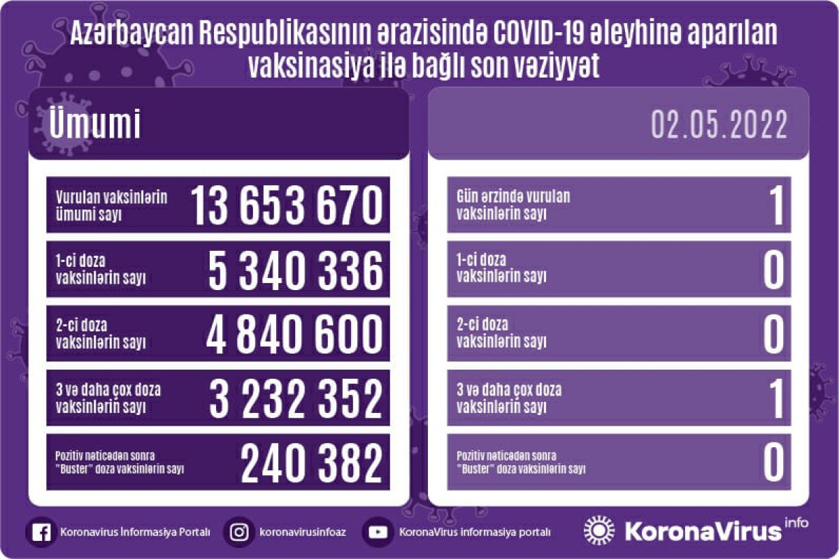 Azərbaycanda son sutkada koronavirus (COVID-19) əleyhinə 1 vaksin vurulub. Bir gündə birinci mərhələ üzrə vaksinasiya olunanların sayı 0, ikinci mərhələ üzrə vaksinasiya olunanların sayı0, üç və daha çox doza üzrə vaksinasiya olunanların sayı 1, pozitiv nəticədən sonra buster doza üzrə vaksinasiya olunanların sayı 0 nəfərdir.