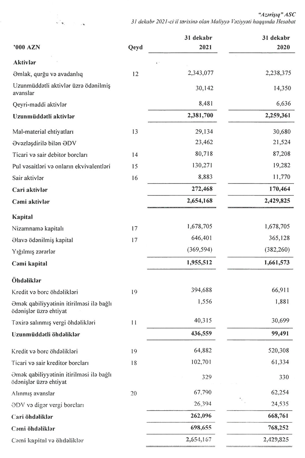 31 Deakbr 2021-ci il tarixində "Azərişıq" ASC 2 milyard 654 milyon 168 min manat cəmi aktivlərə malik olub. Aktivlərin təxminən 81 milyon manatını ticari və debitor borclar təşkil edib.