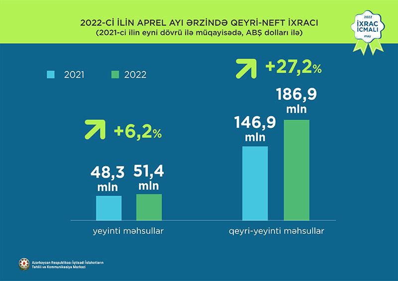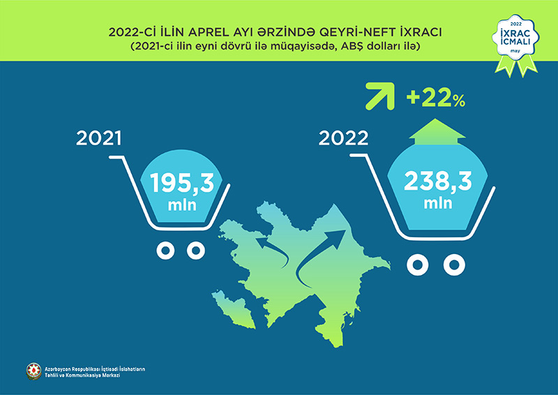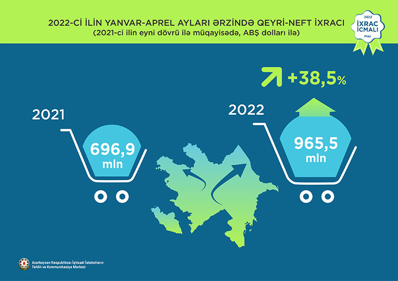 İqtisadi İslahatların Təhlili və Kommunikasiya Mərkəzinin yaydığı məlumatda bildirilir ki, qeyri-neft sektoru üzrə ixrac 2021-ci il ilə müqayisədə 268,6 mln. ABŞ dolları və ya 38,5% artıb.