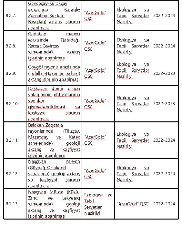 3.6.8.2.5-ci yarımbəndin “Tədbirin adı” sütununda “Vəndam struktur-formasiya zonasında (İsmayıllı rayonu ərazisində) qızıla perspektivli konqlomeratlarda” sözləri “Daşkəsən filiz rayonunun cənub hissəsində (Zivlən-Alxançallı-Şahkərəm-Qaraqullar-Şahvələdli-Çanaxçı) nəcib və əlvan metal yataqları üzrə” sözləri ilə və həmin yarımbəndin “Digər icraçılar” sütununda “İqtisadiyyat Nazirliyi” sözləri “AzerGold” QSC” sözləri ilə əvəz edilsin;